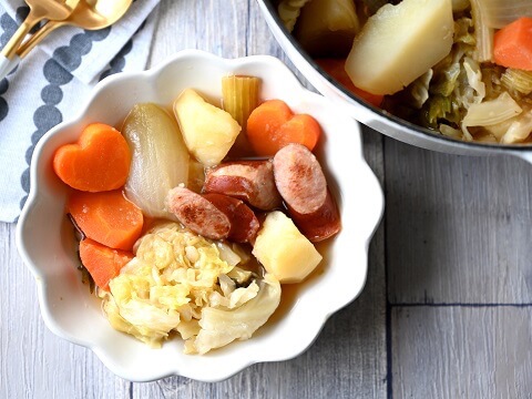 フランス語で「pot」は鍋や壺、「feu」は火で”火にかけた鍋”という意味を持つ「ポトフ」。「ヤマサ ぱぱっとちゃんと これ!うま!!つゆ」と白ワインで野菜の旨味を存分に楽しめる鍋です。