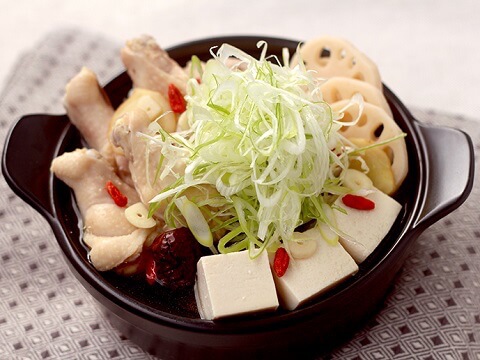 「参鶏湯(サムゲタン)」とは、丸ごとの若鶏に高麗人参やナツメなどの漢方を詰め込こんで煮込む薬膳料理。今回は鶏手羽元を使って簡単にアレンジ。「ヤマサ ぱぱっとちゃんと これ!うま!!つゆ」に、しょうがとにんにくを効かせたスープが絶品です。