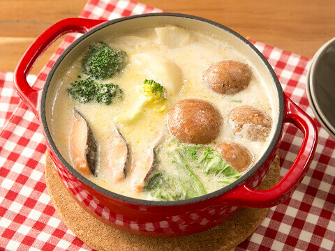 鮭やじゃがいも、かぶなどを入れて、チーズたっぷりで仕上げた豆乳チーズ鍋。お好みのチーズでアレンジしてもおいしくいただけます。