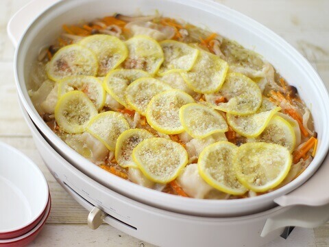 市販の冷凍水餃子を使った、手軽に作れるさわやかなレモン風味の鍋。キャベツやにんじん、しめじも入れ、野菜もたっぷりいただけます。