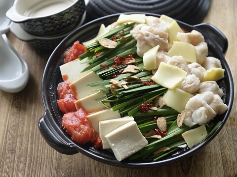 トマトの赤・もつの白・にらの緑がイタリアンカラーの和DEミックスなもつ鍋。定番とひと味違った味わいです。