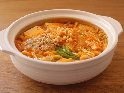 発酵食品の白菜キムチと納豆をダブル使いした、手軽でおいしい具だくさん鍋。白菜キムチは汁気を切らずに、ごま油で香りよく炒めます。