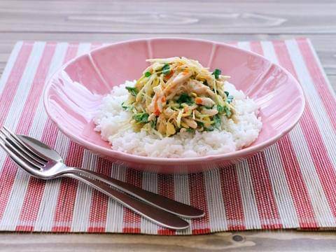 手軽なサラダチキンを使った、おしゃれなヘルシー丼。火いらずで大満足の食べごたえ。「ヤマサ まる生ぽん酢」とマヨネーズに、しょうがとごまの風味を効かせたタレがポイント♪