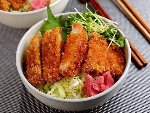 たっぷりの千切りキャベツの上に揚げたてのトンカツをのせた、元気の出るカツ丼。「ヤマサ まる生W(ダブル)おろしぽん酢」をかければ、揚げ物もさっぱりとおいしくいただけます。