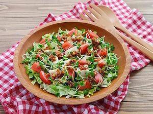 しらす、にんにく、ごま、ピーナッツをたっぷりと使い、カリカリに炒めた食感が楽しいサラダ。ドレッシングは、「ヤマサ まる生ぽん酢」とみりんを合わせて。ほどよい甘酸っぱさで食が進みます♪