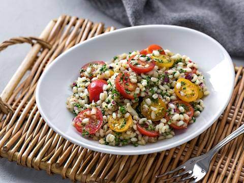 フランスや中東で食されるサラダ「タブレ」。一般的には「クスクス」というパスタを使いますが、今回はもち麦でアレンジしました。ドレッシングは、「ヤマサ まる生ぽん酢」とオリーブオイルで味が簡単に決まります。