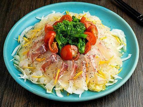 たっぷりの新玉ねぎのスライスにたいの刺身を盛った、おもてなしにもピッタリのサラダ。味付けは、卓上で「ヤマサ まる生ぽん酢」とオリーブオイルをかけるだけなので楽ちんです。