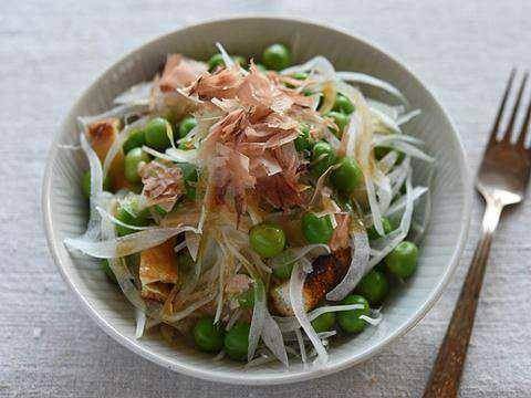 新玉ねぎに、グリーンピースとこんがり焼いた油揚げを合わせた、和風なサラダ。仕上げに、たっぷりのかつお削り節をかけ、ドレシングは「ヤマサ まる生ぽん酢」1本にお任せです。