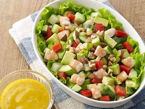 ダイス状に小さくチョップした(=叩くようにして切った)野菜にドレッシングを絡めたチョップドサラダ。ドレッシングは、「ヤマサ まる生ぽん酢」・マンゴー・オリーブオイル・塩・こしょうで、トロピカルな味わいに。