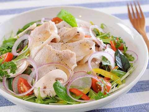 豚の冷しゃぶに、彩り野菜を合わせたサラダ。ドレッシングは「ヤマサ まる生ぽん酢」と黒こしょうでシンプルに。