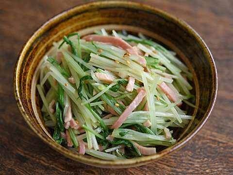 さっとゆでた水菜に、ハムを合わせて彩りも良く。ドレッシングは、「ヤマサ まる生ぽん酢」とサラダ油を合わせ、仕上げに白いりごまをかけて香ばしさを加えます。