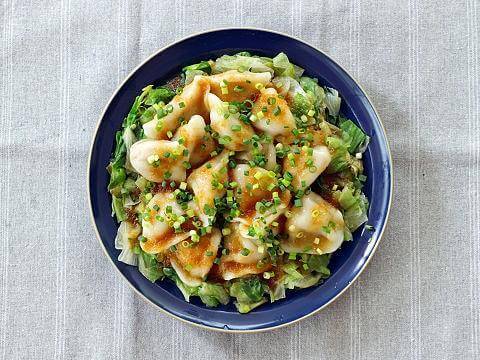 レタスと餃子を豪快に盛って、「ヤマサ まる生W(ダブル)おろしぽん酢」をたっぷりとかけるだけ。ガッツリだけど後味は爽やか、箸が止まらないボリュームサラダです。