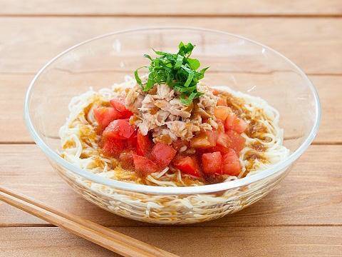 冷たいそうめんにツナとトマトをのせて、「ヤマサ まる生W(ダブル)おろしぽん酢」をかけるだけ。おろしの風味と酸味が食欲をそそる、暑い日にうれしい簡単ひんやり麺です。