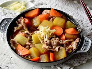 <乱切り>野菜の端から45度くらいの角度で包丁を入れます。包丁の角度は変えず、野菜を四分の一ほどずつ回しながら上に向けて切っていきます。火の通り方を同じにするため、大きさを揃えるように切ることがポイント。この切り方は煮物だけでなく、酢の物や炒め物、マリネなど幅広く使うことができます。