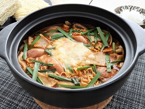 ブテとは韓国語で部隊、そしてチゲは鍋ですから 日本語にすると「部隊鍋」。本場韓国でも人気の大衆メニューです。