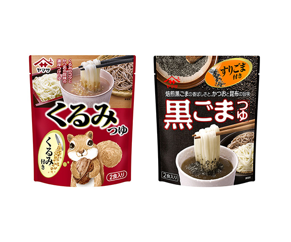 近年の核家族増加による個食化や、味に対する嗜好の広がりから、一食ごとに使い切ることができるタイプのつゆの定着化が進んでいます。そんな市場背景のもと、春夏に人気の高いざるうどん、ざるそばのつけつゆの新しいご提案として、『ヤマサ くるみつゆ 2食入り』164g(つゆ80g×2袋、くるみ2g×2袋)と、『ヤマサ 黒ごまつゆ 2食入り』166.6g(つゆ80g×2袋、すりごま3.3g×2袋)の使いきり個食タイプを新発売します。