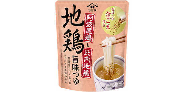 当社では、徳島県の特産物で、丹念に飼育された阿波尾鶏と、薩摩地鶏や名古屋コーチンと並ぶ日本三大美味鶏の一つとして有名な秋田県の比内地鶏、この2種のおいしさを掛けあわせたストレートつゆ『ヤマサ 地鶏旨味つゆ 2食入り』162g(つゆ80g×2袋、金ごま1g×2袋)を新発売します。