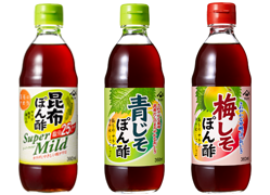 酸味・塩味・しょうゆ感をやわらかに抑えたマイルドな味わいの『ヤマサ 昆布ぽん酢 スーパーマイルド』360mℓびんを、『ヤマサ 昆布ぽん酢』より塩分を25%カットして、一層カラダにやさしい味にリニューアルします。また、『ヤマサ 青じそぽん酢』360mℓびんは、しょうゆ感をやわらかく仕上げ、青じその自然な風味をアップさせ、レモン果汁とりんご酢のすっきり感をよりいかした味わいにリニューアルします。