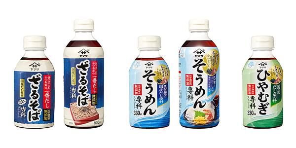 『ヤマサ そうめん専科』330mℓパック/500mℓパックの味とパッケージ、また『ヤマサ ひやむぎ専科』330mℓパック、『ヤマサ ざるそば専科』330mℓパック/500mℓパックのパッケージをリニューアルします。パッケージにて国産だし原料を使用していることをうたいます。