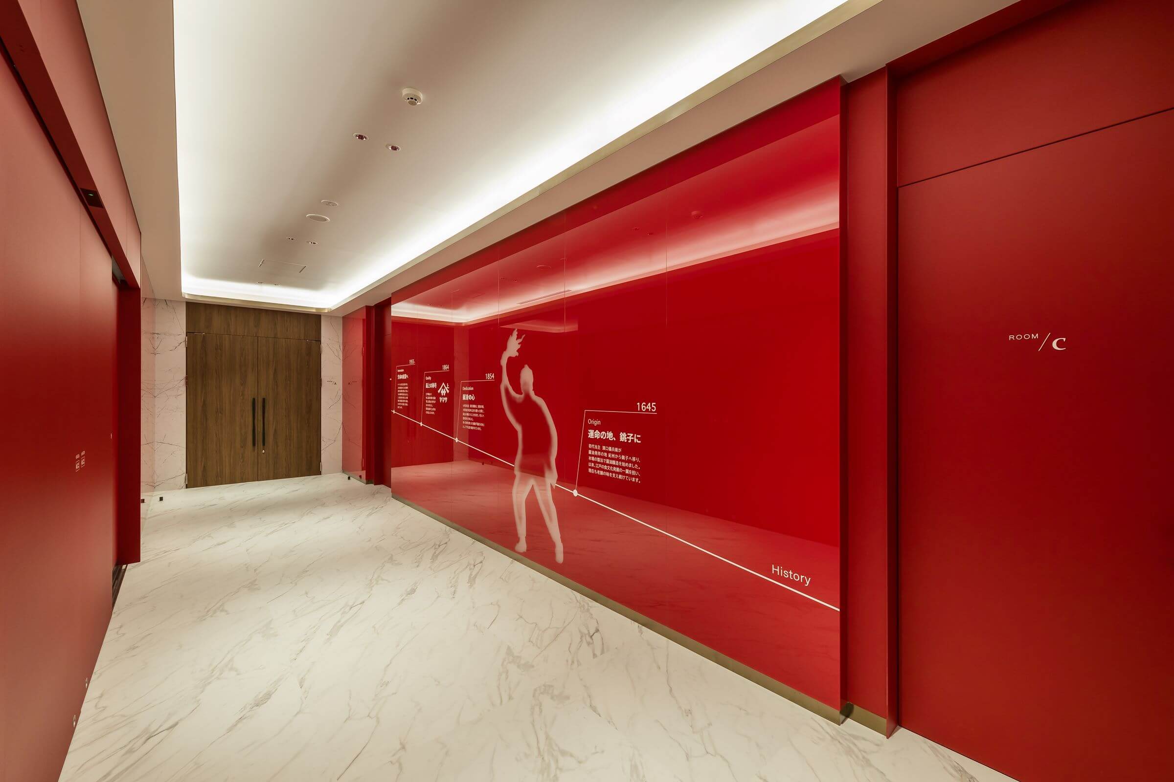 各プレゼンテーショーンルームに面したホワイエには、象徴的なヤマサレッドのカラーガラスに刻まれた7代目当主 濱口梧陵の「稲むらの火」のシルエットが、その前後に続くヤマサ醬油の歴史を語りかけています。