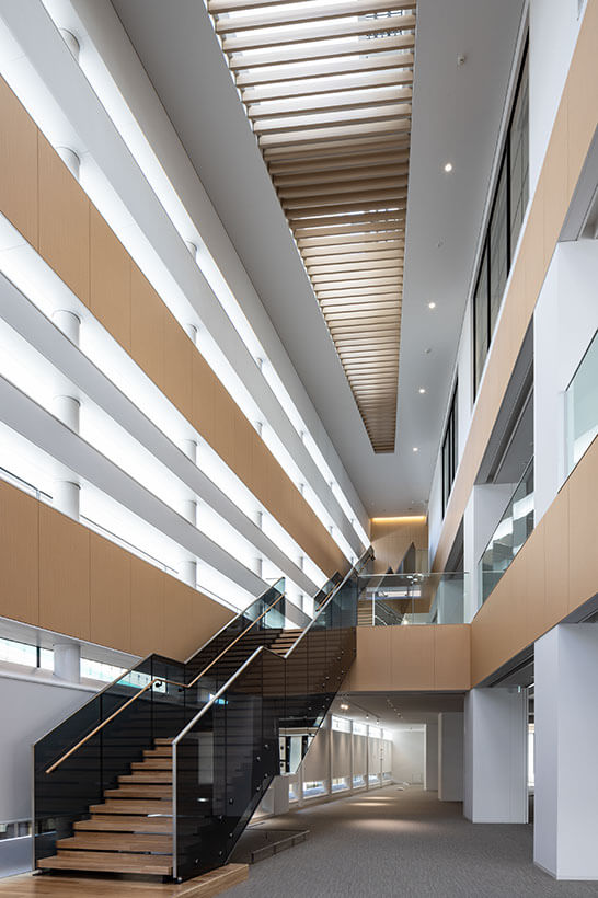 天井面の放射パネルからの放射熱によって空調する放射空調システムを採用。温度ムラが少なく、効率のよい運転が可能なため、省エネルギー及びCO2排出量削減にもつながり、地球環境に配慮したシステムです。
