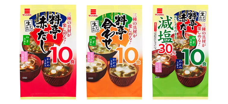 即席みそ汁の定番『サンジルシ 即席みそ汁料亭赤だし』、『サンジルシ 即席みそ汁料亭合わせ』、『サンジルシ 即席みそ汁減塩料亭赤だし』の味・パッケージがリニューアルすることに伴い、全国で販売を開始いたします。