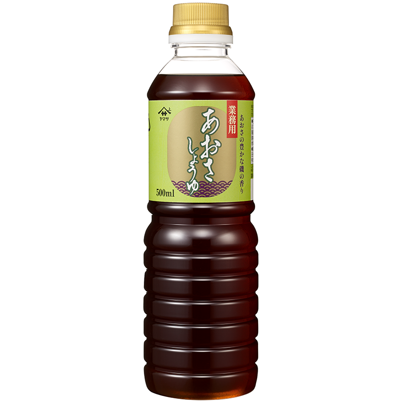 あおさの濃厚な味わいと豊かな磯の香りとコクを活かした、やわらかな甘さのしょうゆ。味噌汁やラーメン、魚介類の味付けや茹でた素材、蒸した素材のかけだれにと様々なレシピにご活用いただけます。