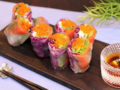 「ヤマサ昆布ぽん酢スーパーマイルド」でマリネした紫キャベツ、サーモン、クリームチーズが彩り鮮やかな生春巻き。夏のおもてなしにもおすすめです。