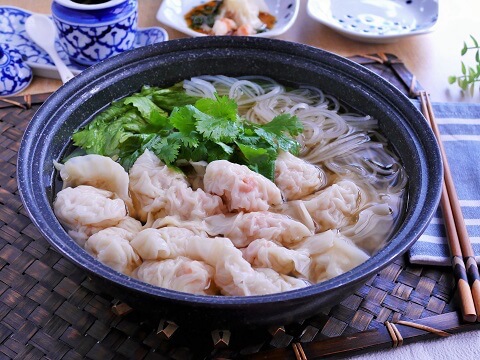 プリプリの海老水餃子とツルツル春雨を「ヤマサ昆布ぽん酢」ベースのにらダレでさっぱりといただく夏鍋です♪