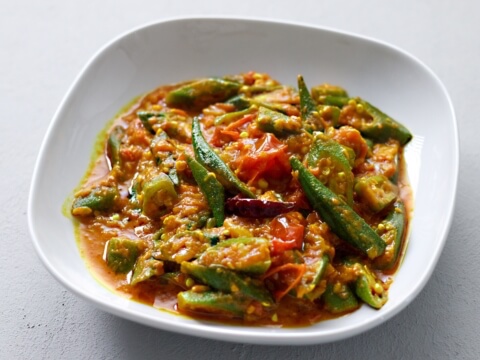 インドの家庭料理”サブジ”。夏が旬のオクラやトマトなどをカレー粉と「ヤマサ昆布ぽん酢 スーパーマイルド」を使ってまろやかで酸味のあるスパイシーテイストに仕上げます。