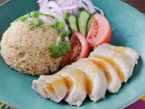 シンガポールの名物料理「海南鶏飯」が15分で完成!電子レンジで蒸し鶏を作り、煮汁を玄米ご飯に混ぜ込む時短レシピです。