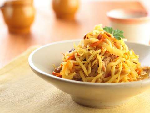 そうめんにごま油の香りとラー油の辛味を足し、豚肉や野菜と一緒に巻きます。