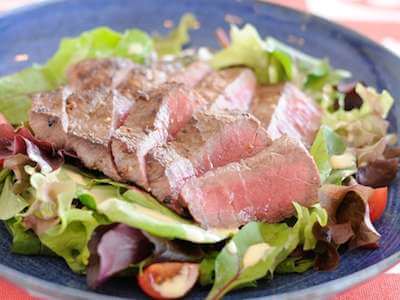 手仕事5分で、この豪華さ!ガツンとパンチの効いたガーリックステーキに、わさびぽん酢がよく合います。
