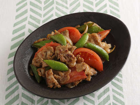 豚ばら肉に、「ヤマサ昆布ぽん酢」とたっぷりのニンニクを効かせた、ボリューム満点の炒め物。トマト、スナップえんどうも加え、彩りよく仕上げます。