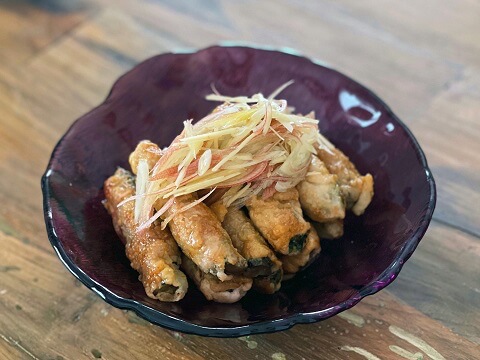 なすに大葉と豚肉を巻き、こんがりと焼いて「ヤマサ昆布ぽん酢」に漬け込むだけ。刻んだみょうがをたっぷりとのせていただきます。