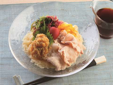 さわやかなしょうがと大葉、そして「ヤマサ昆布ぽん酢」の薬味おろしが、そうめんと豚しゃぶによく絡み、最後のひと口までおいしくいただけます。