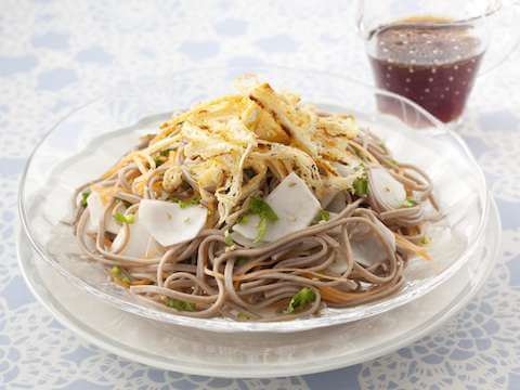 いつものそばでは物足りない時にぜひ試していただきたいメニュー。カリッと香ばしく焼いた油揚げに「ヤマサ昆布ぽん酢」×ごま油のだし汁がしみて、お腹も大満足!