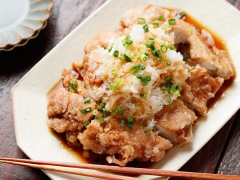 「肉×昆布ぽん酢」のさっぱり効果を一番実感できるのが唐揚げ。揚げ方にもひと工夫!肉1枚を丸っと揚げることで、通常の唐揚げより油の吸収率が下がるため、ボリュームおかずながら、ヘルシーに仕上がります。