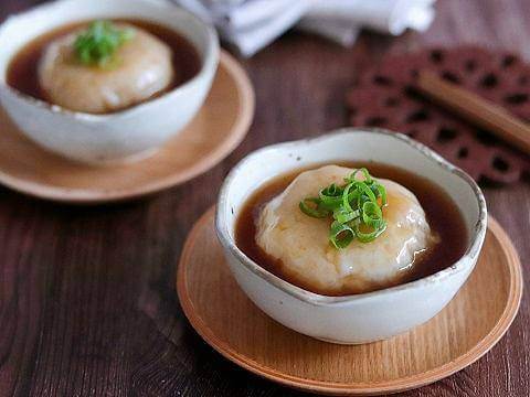 海老のぷりぷりと蓮根のシャキシャキとした食感が楽しい団子に、「ヤマサ昆布ぽん酢」ベースの上品なあんをかけ、“しんじょ”に。料亭のような仕上がりで、おもてなしにもおすすめです。