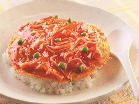 アツアツのぽん酢あんが食欲をそそる、ふわふわ卵の天津飯。あんは「ヤマサ昆布ぽん酢」にケチャップを加えることで、食欲をそそる色味に仕上がります。