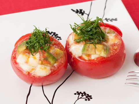 中身をくり抜いたトマトを器にし、中に「ヤマサ昆布ぽん酢」で和えたアボカドやモッツァレラチーズなどを詰めてオーブンで焼いた、ヘルシーなベジココット。見た目もかわいいので、おもてなしにもおすすめです♪