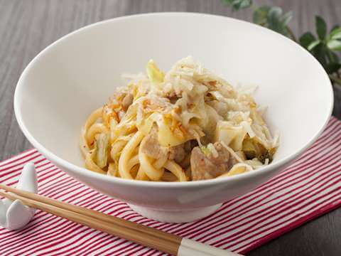 うどんにだって「ヤマサ昆布ぽん酢」!豚肉とキャベツの具材に、うどんとキムチ、そして「ヤマサ昆布ぽん酢」を加えて炒め、塩・こしょうで味を調えれば完成。仕上げにたっぷりのチーズを鬼盛りにした、お腹も大満足な一品☆