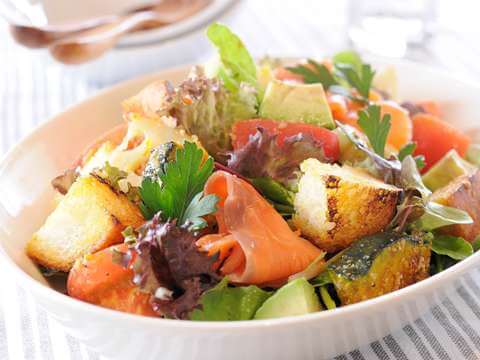 ”パンツァネッラ”はイタリアのトスカーナ地方に伝わる、残ったパンをリメイクしたサラダ。お手製ドレッシングも「ヤマサ昆布ぽん酢」があれば簡単に♪オリーブオイルを入れたボウルに、「ヤマサ昆布ぽん酢」と白すりごまを加え、塩・こしょうで味を調えれば、野菜と最高に相性のいいドレッシングの完成です。