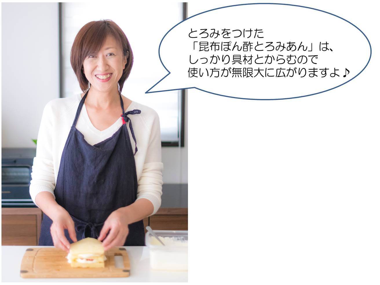 そんな「昆布ぽん酢とろみあん」を使って、アレンジレシピを作ってくれたのは、ヤマサのHappy Recipeでも人気の料理研究家・たっきーママこと奥田和美さん。オフィシャルブログ「おしゃべりな台所」をはじめSNSやテレビなどでも大活躍。また、分かりやすくておいしいと評判のレシピ本も累計124万部を突破し話題です。