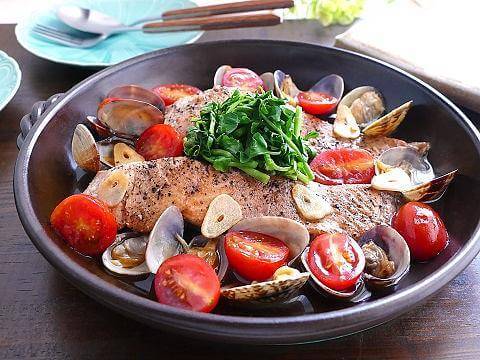 青っぽくさわやかな香りの山菜「セリ」がアクセント!「ヤマサ昆布ぽん酢」で仕上げる和風な鮭のアクアパッツアです。「ヤマサ昆布ぽん酢」のうま味と柑橘の香りが魚介のおいしさを引き立てます。