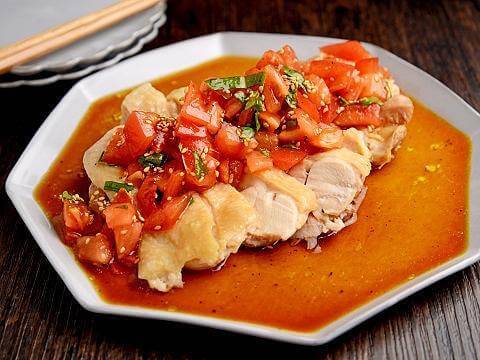 しょうがとねぎで蒸しあげた鶏肉に、トマト×バジル×「ヤマサ昆布ぽん酢」のソースをたっぷりとかけ、さわやかに仕上げた一品。
