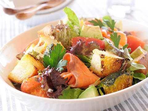 パンツァネッラはイタリアのトスカーナ地方に伝わる、古く硬くなったパンをリメイクしたサラダのこと。ドレッシングには、酢の代わりに「ヤマサ昆布ぽん酢」を使うことでやわらかな酸味とうま味を加えます。