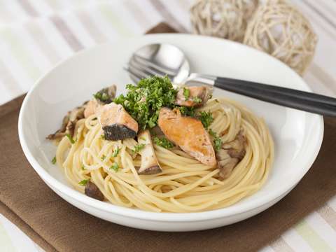 きのこと鮭、旬の食材同士の組み合わせがおいしい秋パスタ。鮭を焼いたら後、きのこを加えて炒め香ばしさをアップさせるのがポイント。