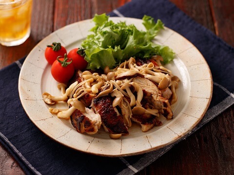 パリっと焼いた鶏肉にきのこをたっぷりのせたごちそチキンステーキ。鶏肉を焼く際、出てきた脂をペーパータオルでマメに拭き取りながら焼くのが、皮をパリッと焼き上げるコツです。