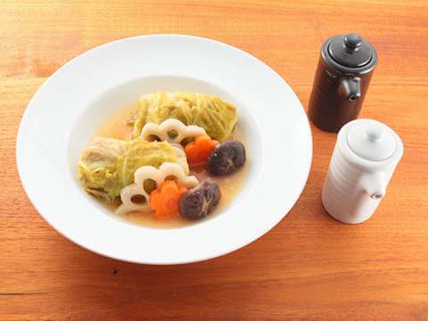 洋食屋さんでも人気メニューの「ロールキャベツ」を和風にアレンジ。「ヤマサ昆布ぽん酢」を効かせた肉ダネが、つみれのような味わいに。